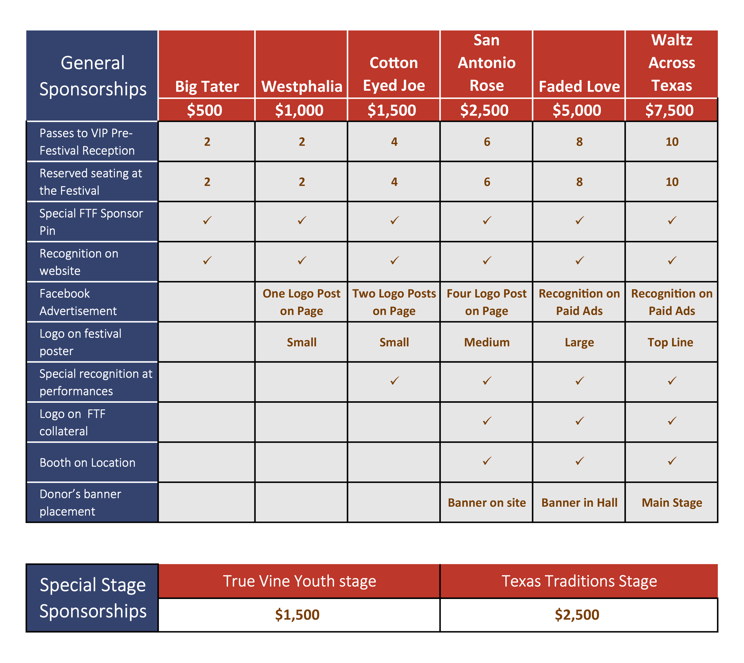 Any level of support helps the Festival continue in its mission of supporting and presenting the best of Texas fiddling and dance.